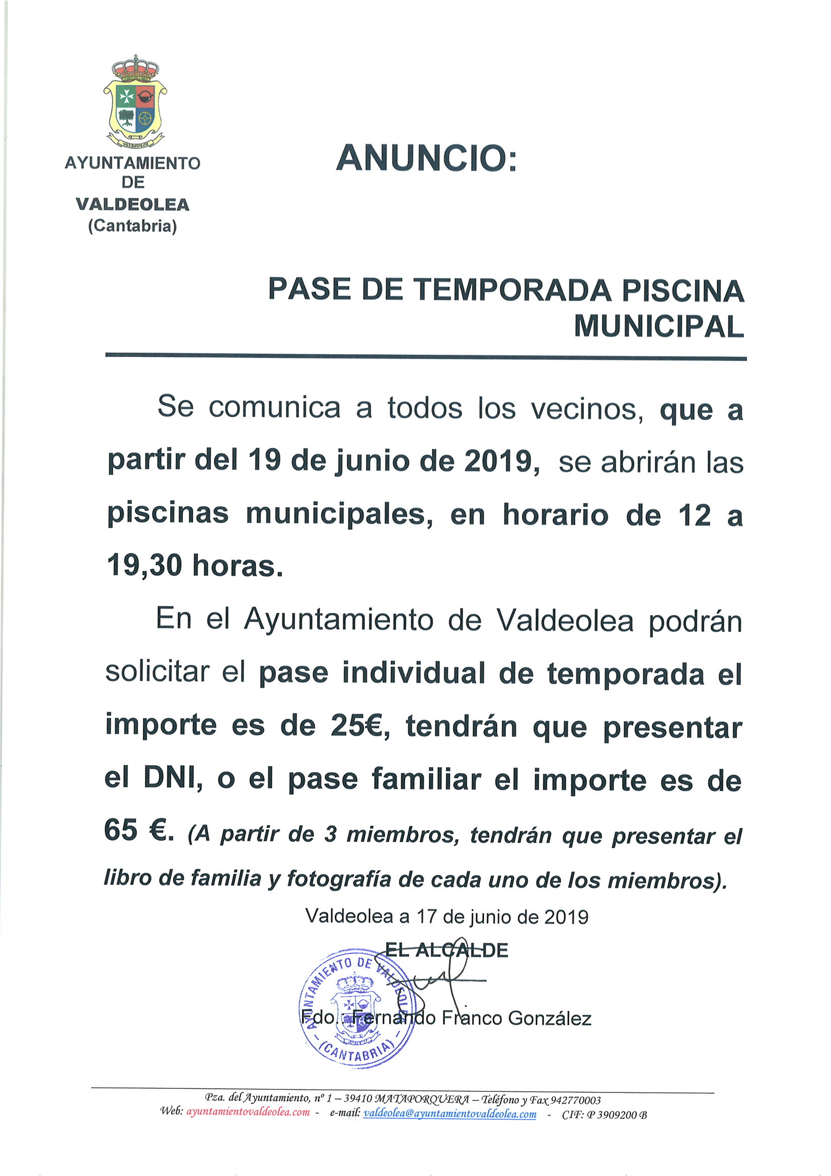 En el Ayuntamiento de Valdeolea podrán solicitar el pase individual de temporada, el importe es de 25€. (imprescindible fotografia y DNI)