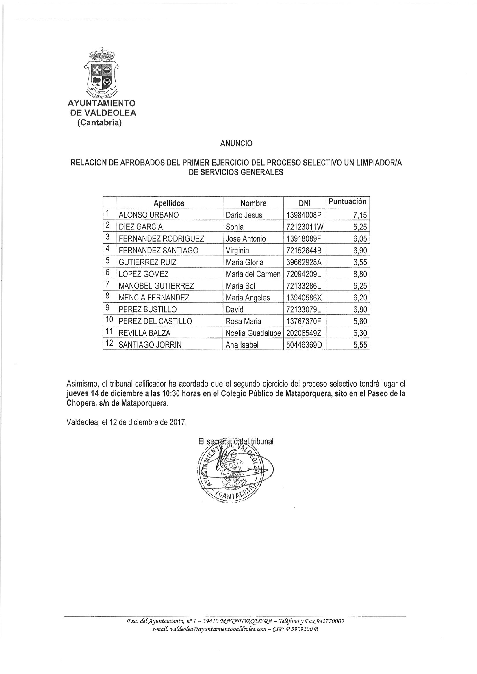 Asimismo, el tribunal calificador ha acordado que el segundo ejercicio del proceso selectivo, tendrá lugar el jueves 14 de diciembre a las 10:30 horas en el Colegio Público de Mataporquera, sito en Paseo de la Chopera, s/n de Mataporquera.