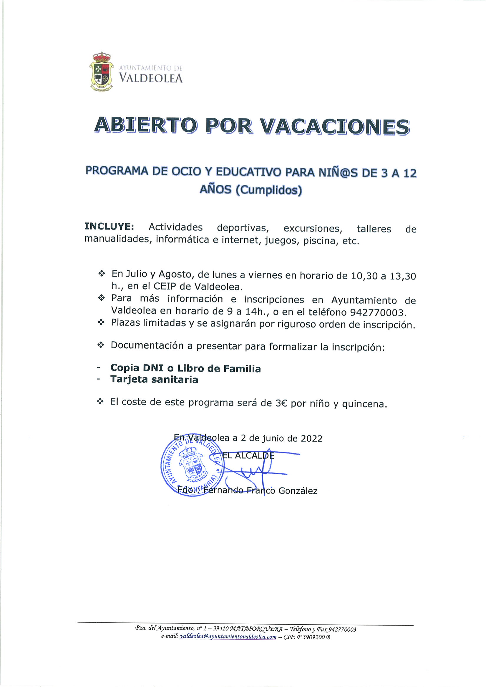 - Para más información e inscripciones en Ayuntamiento de Valdeolea, teléfono 942770003.