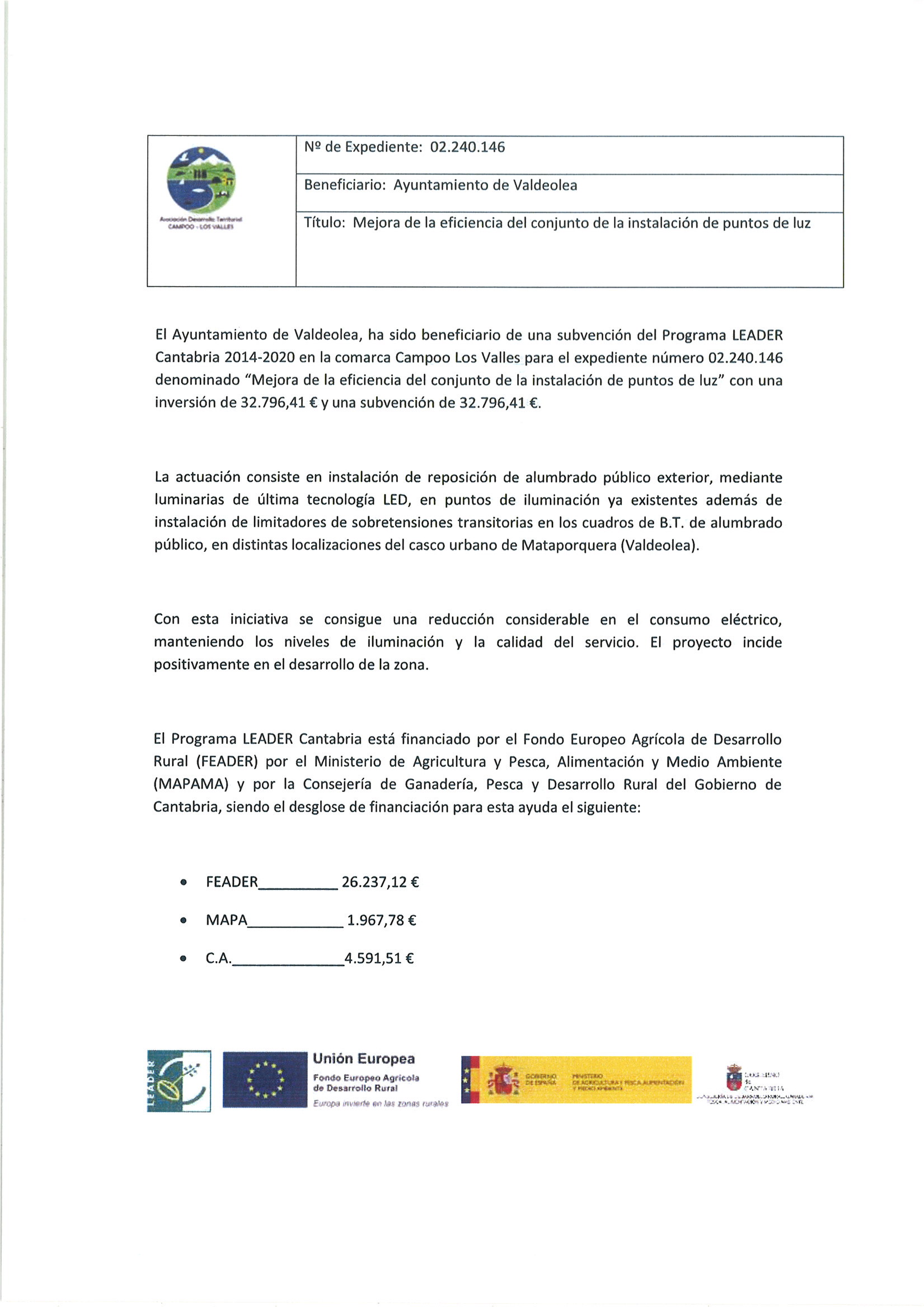 Subvención para “Mejora de la eficiencia del conjunto de la instalación de puntos de luz” con una inversión de 32.796,41 € y una subvención de 32.796,41 €.