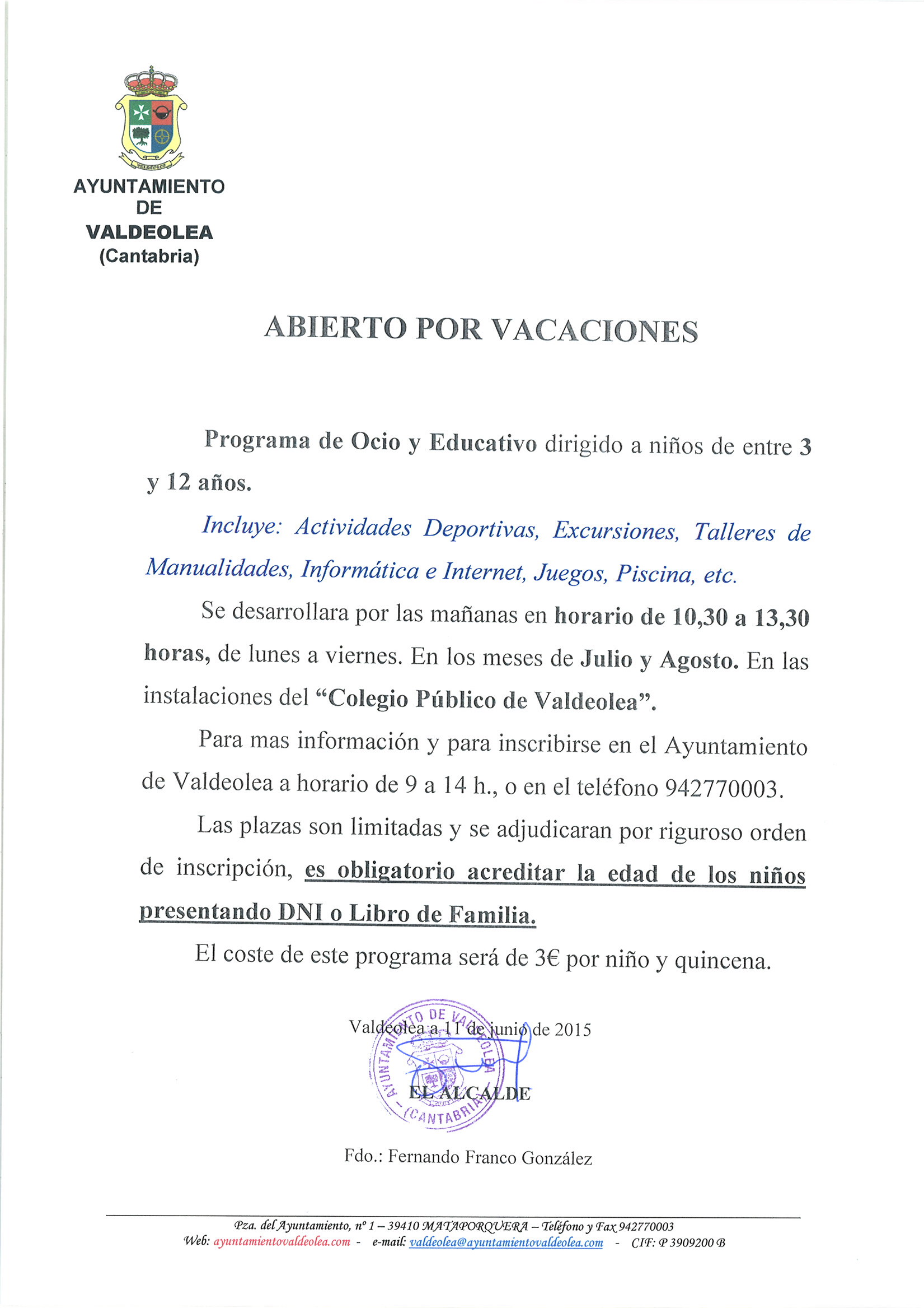 Para mas información en Ayuntamiento de Valdeolea en horario de 9 a 15 h., o telefono 942770003.