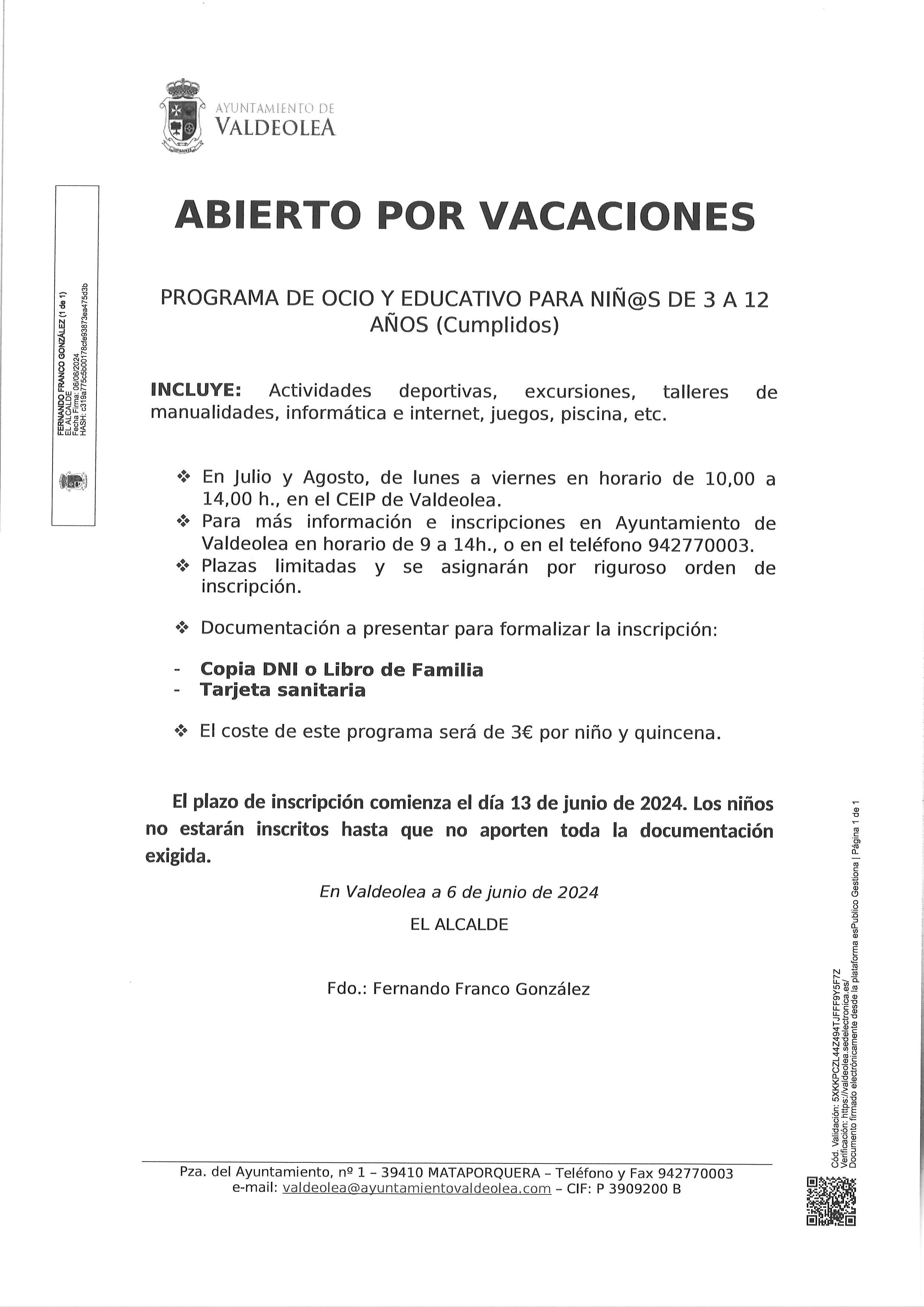 El plazo de inscripción comienza el día 13 de junio de 2024 en el Ayuntamiento de Valdeolea. Los niños no estarán inscritos hasta que no aporten toda la documentación exigida.